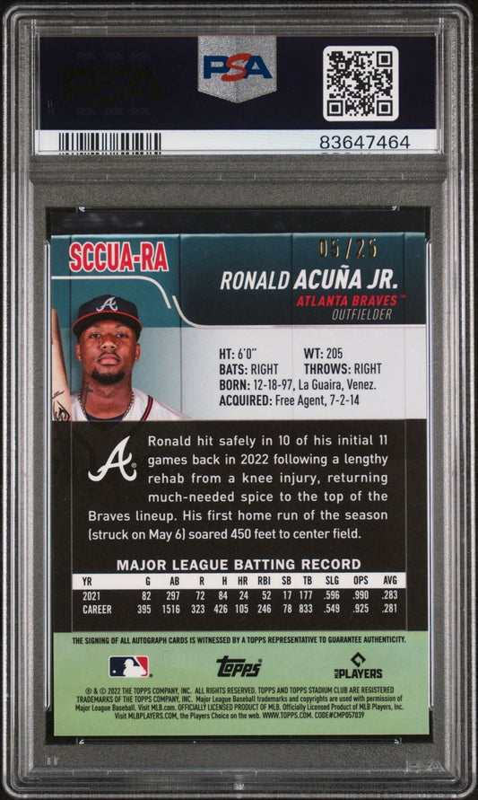 Ronald Acuna Jr. 2022 Stadium Club Chrome Orange Refractor Autograph #'d 05/25 PSA 10