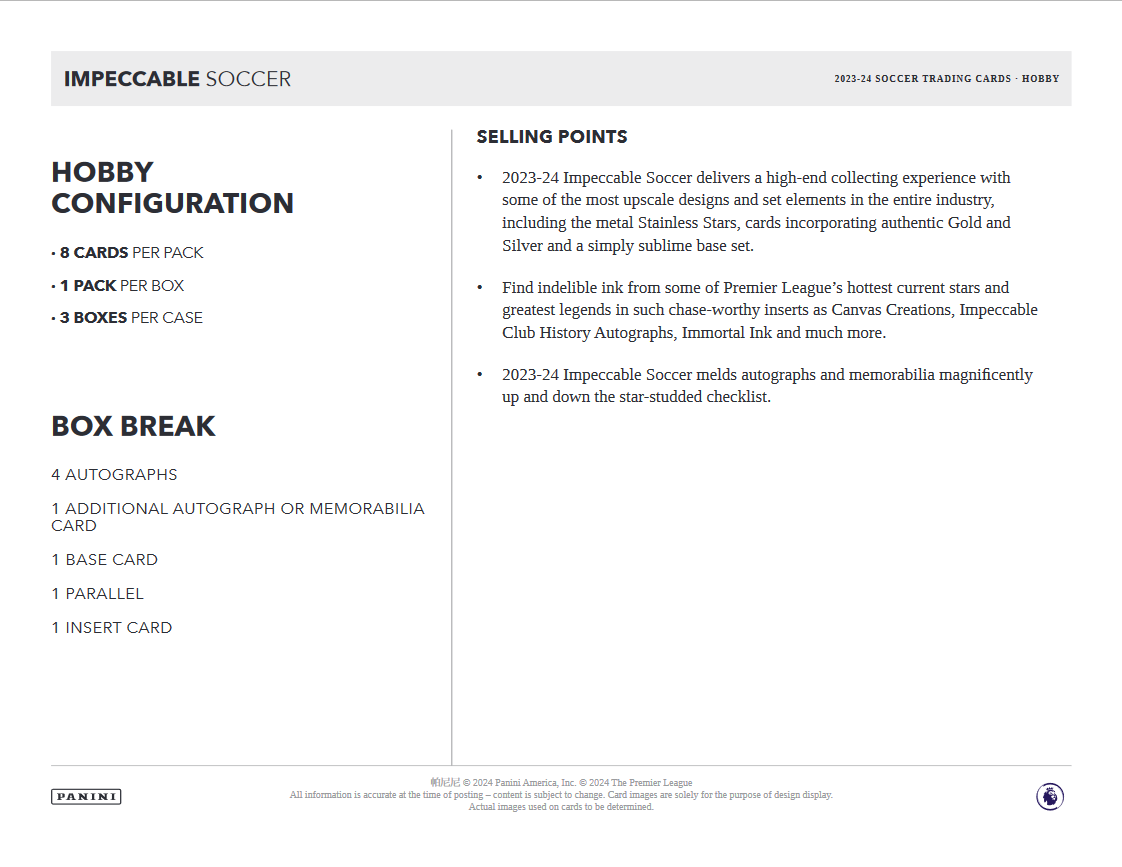 - 2023-24 Impeccable Soccer delivers a high-end collecting experience with some of the most upscale designs and set elements in the entire industry, including the metal Stainless Stars, cards incorporating authentic Gold and Silver and a simply sublime base set.