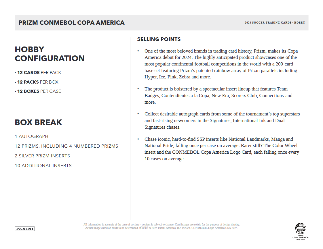 - The highly anticipated 2024 Prizm CONMEBOL Copa America showcases one of the most popular continental football competitions in the world with a 200-card base set featuring Prizm’s patented rainbow array of Prizm parallels including Hyper, Ice, Pink, Zebra and more.