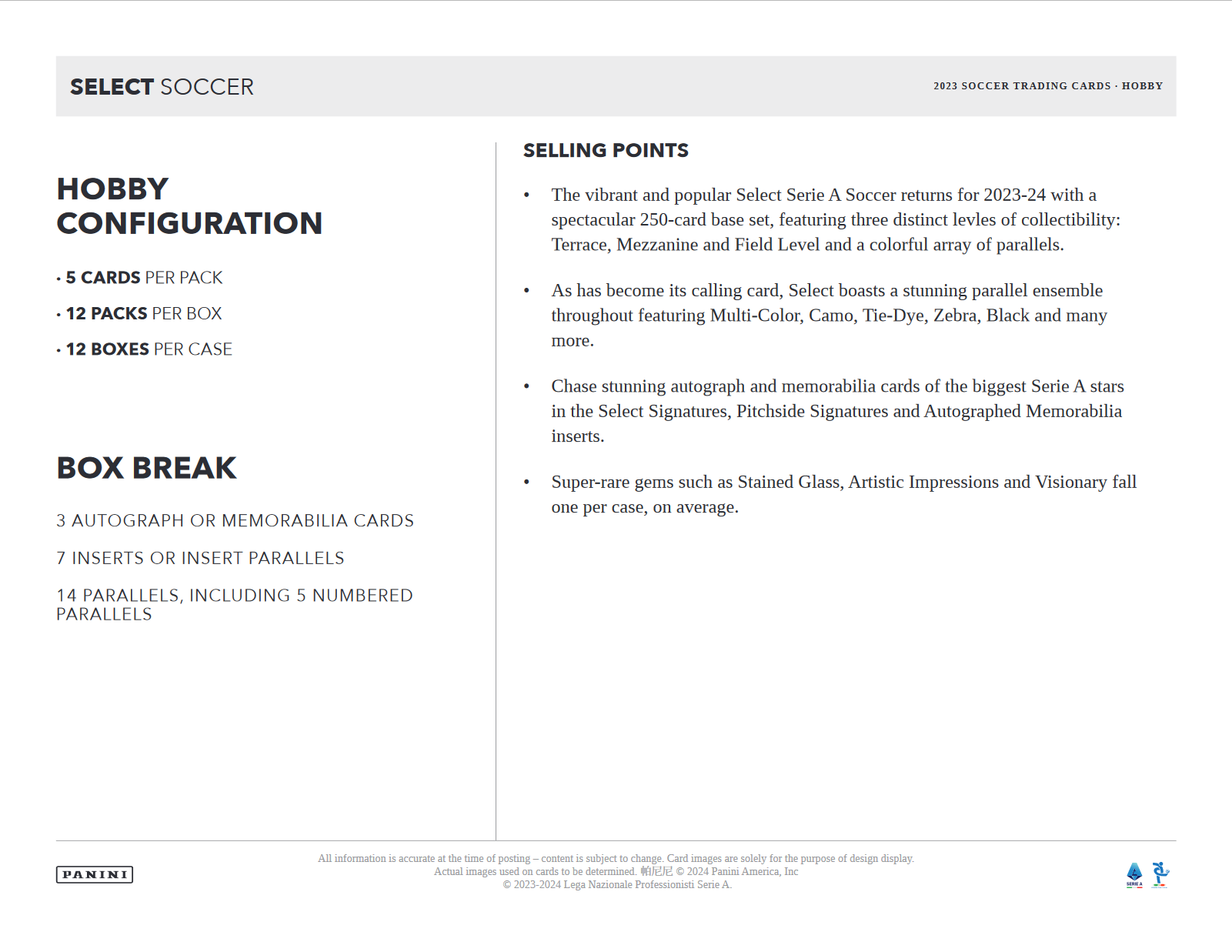 - The vibrant and popular Select Serie A Soccer returns for 2023-24 with a spectacular 250-card base set, featuring three distinct levels of collectability: Terrace, Mezzanine and Field Level and a colorful array of parallels.