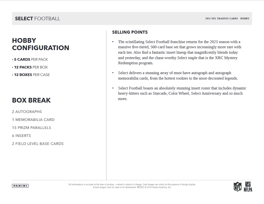 - The scintillating Select Football franchise returns for the 2023 season with a massive five-tiered, 500-card base set that grows increasingly more rare with each tier. Also find a fantastic insert lineup that magnificently blends today and yesterday, and the chase-worthy Select staple that is the XRC Mystery Redemption program.