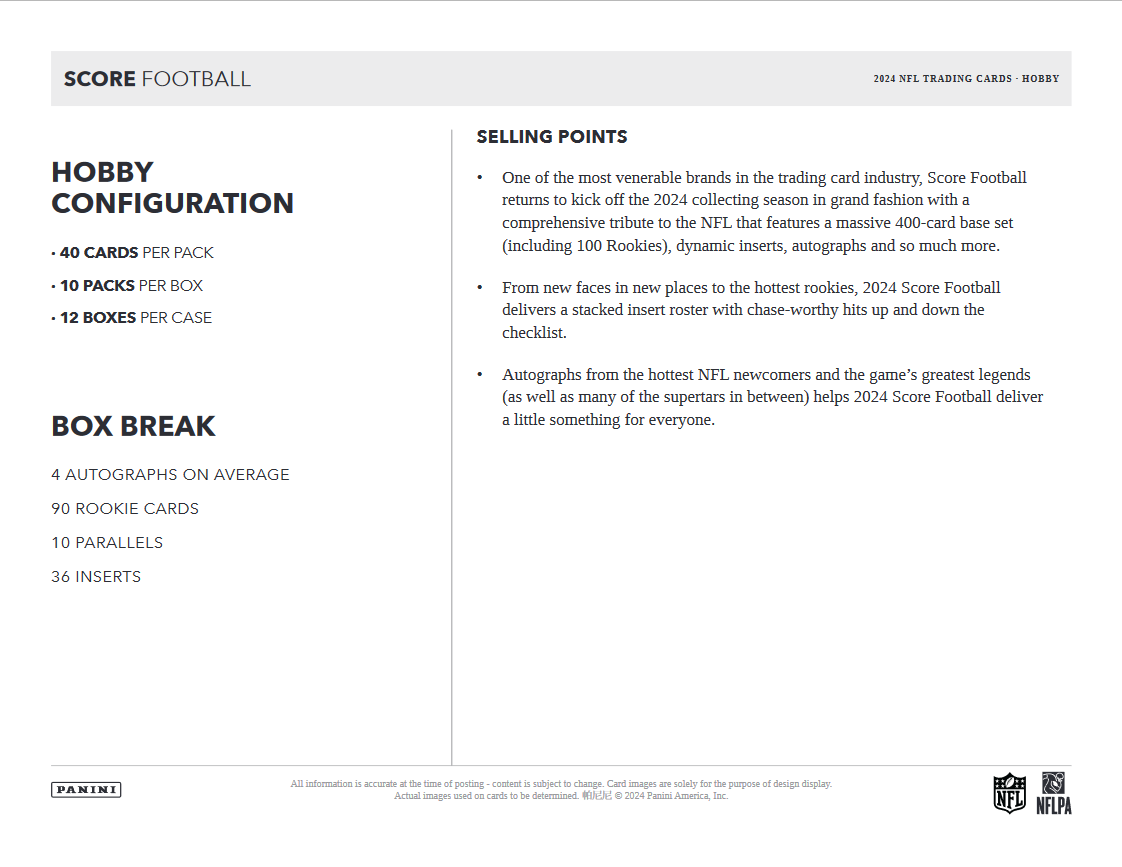- One of the most venerable brands in the trading card industry, Score Football returns to kick off the 2024 collecting season in grand fashion with a comprehensive tribute to the NFL that features a massive 400-card base set (including 100 Rookies), dynamic inserts, autographs and so much more.