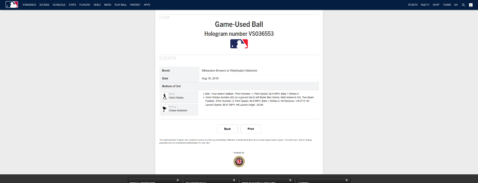 Piece of the Game Offers some of the most Unique and Hard to find MLB Game used balls on the Market. Our Goal is to have some of the best Game used Baseballs from some of the games biggest stars and rookies. Why Buy a game used baseball card or relic card for a swatch the size of a quarter of the actual game used item when you can own the entire ball or Stat that was used on the field. See our Patent Pending Baseball Identity and Future soon to be released Baseball Authenticate Masterpieces High end Game used Product. Take home a piece of Baseball History!