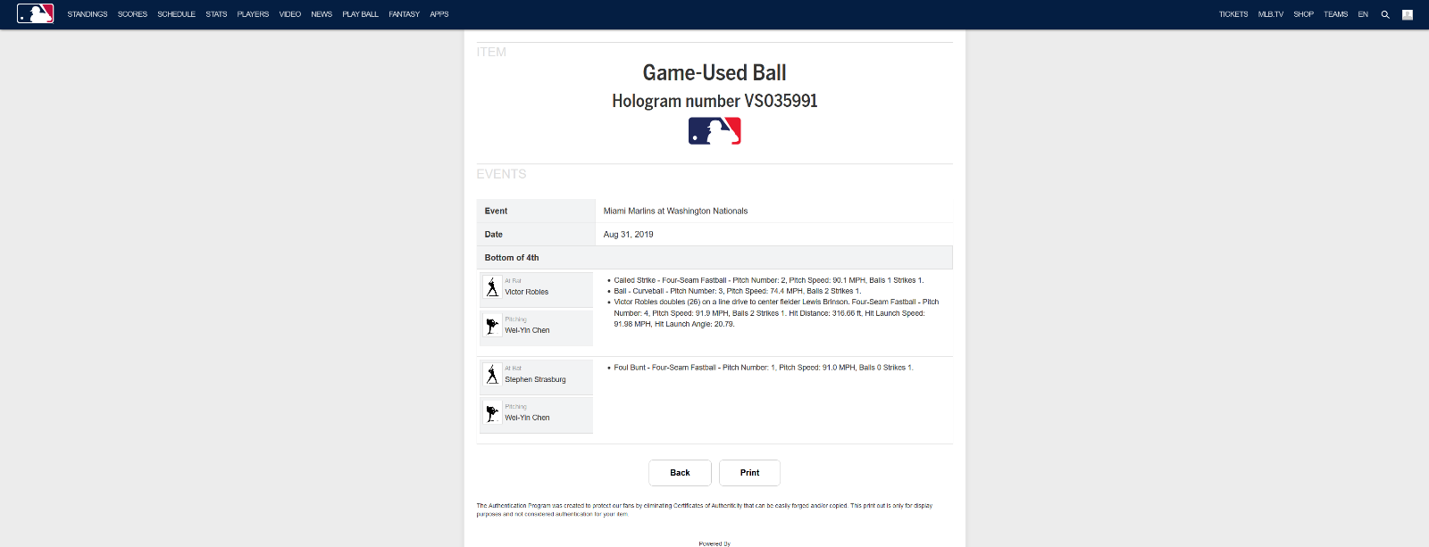 See Pics of the exact baseball and a Screen Shot of the MLB Authentication page from MLB and there authenticator.